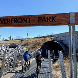 \nWe love exploring the paved pathways along the Bow River in Cochrane, starting from Riverfront Park off Griffin Road. In this park, you’ll find a short, paved loop to ride with your family, which is relatively flat and perfect for novice riders. We like to stop by the creek to play, and we always head up to visit the tunnel that crosses under Griffin Road.