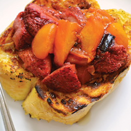 Grill the French toast on both sides; about 2 minutes on the first side and 1 minute on the second, flipping as necessary. Close the lid to create an oven environment, which will help them cook through. Serve them right away with syrup and fresh fruit, or keep them warm on the top rack of the grill or in a 200°F oven while you cook the rest. Serves 4.