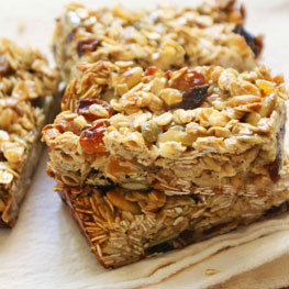 Combine all the ingredients in a large bowl and mix well. Press evenly into the prepared pan. Bake for 20 to 25 minutes, or until golden. Cool slightly, then flip out onto a cutting board and cut into bars. Wrap individually in plastic wrap for easy lunch packing. Makes about 16 bars.